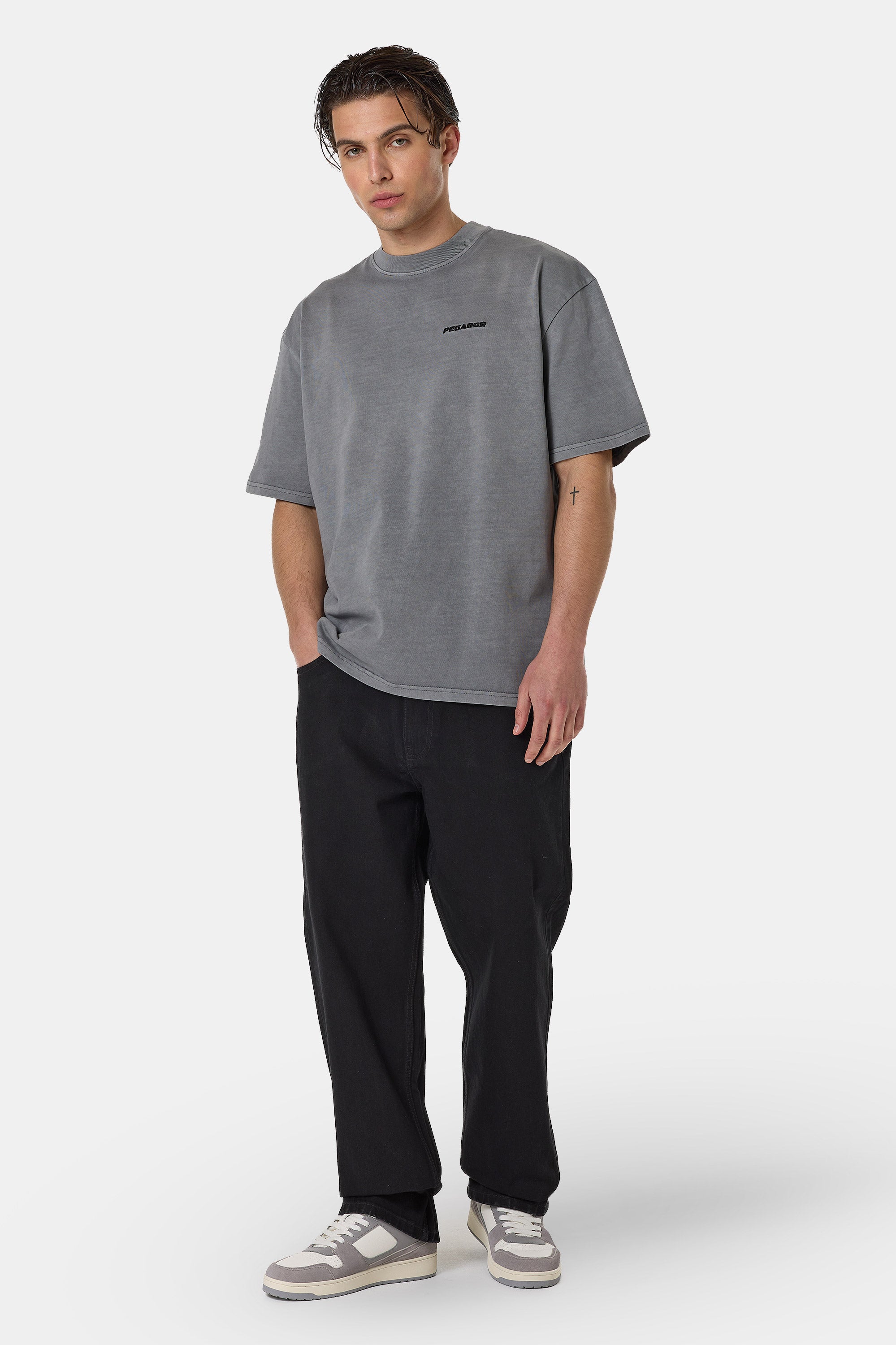 - grey reflective logo print to to the left sleeve